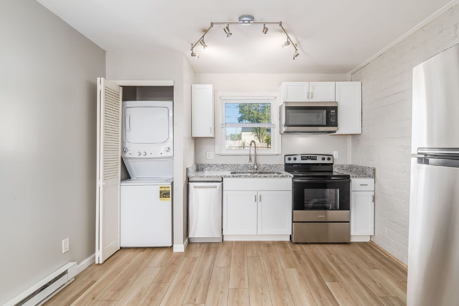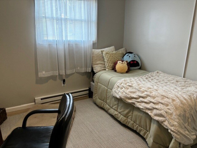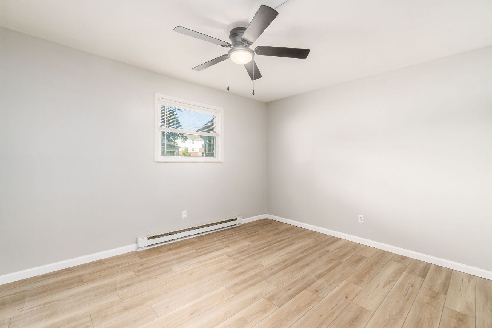 Hardwood floors, window unit A/C, baseboard heat.