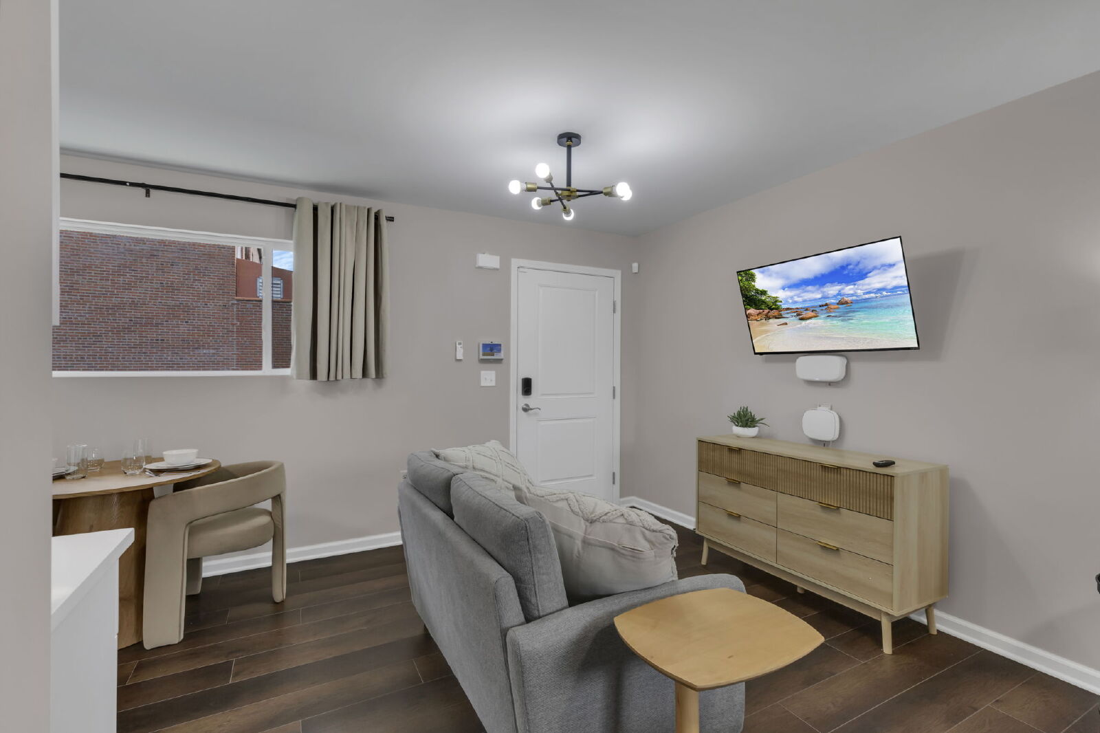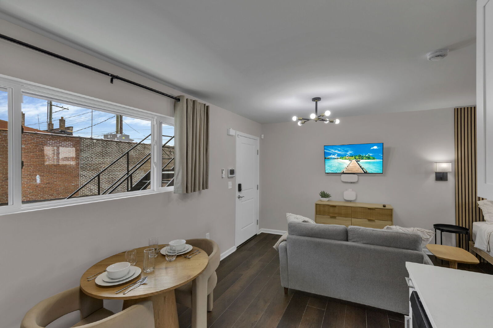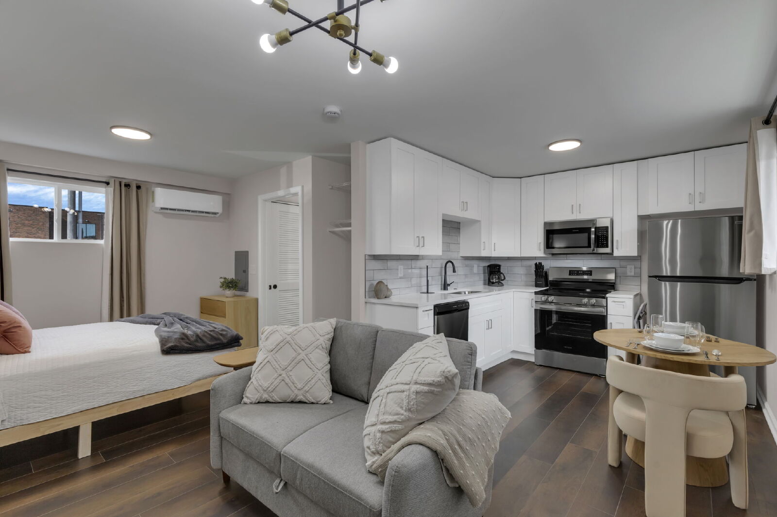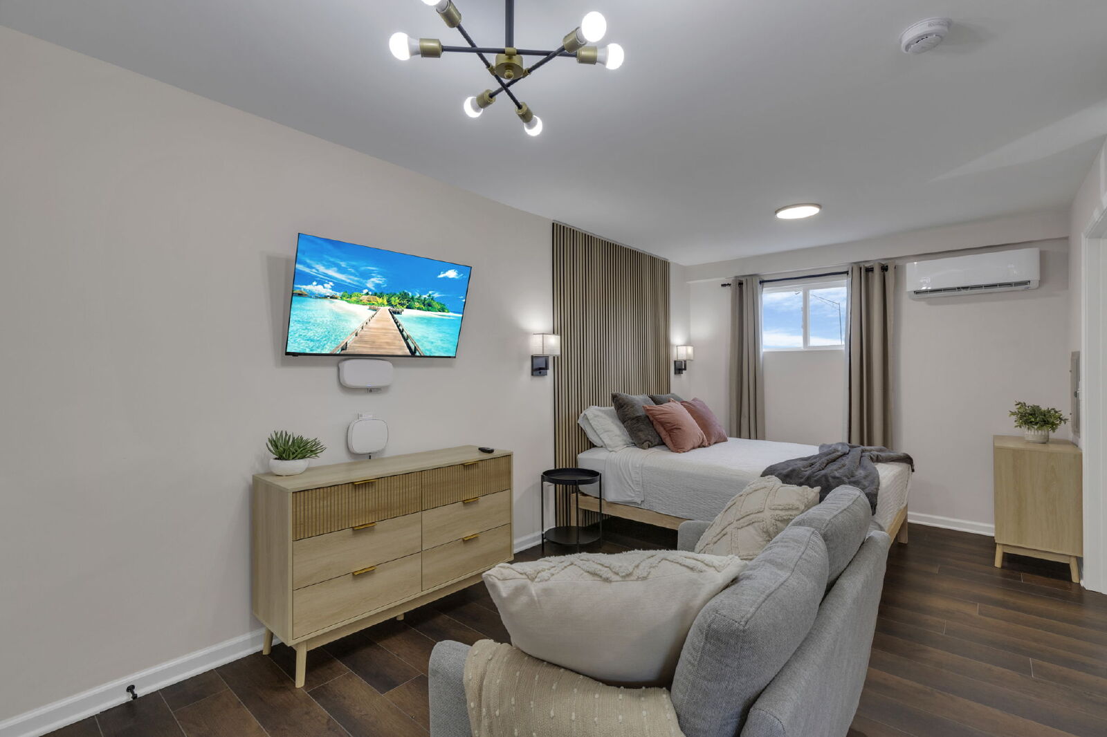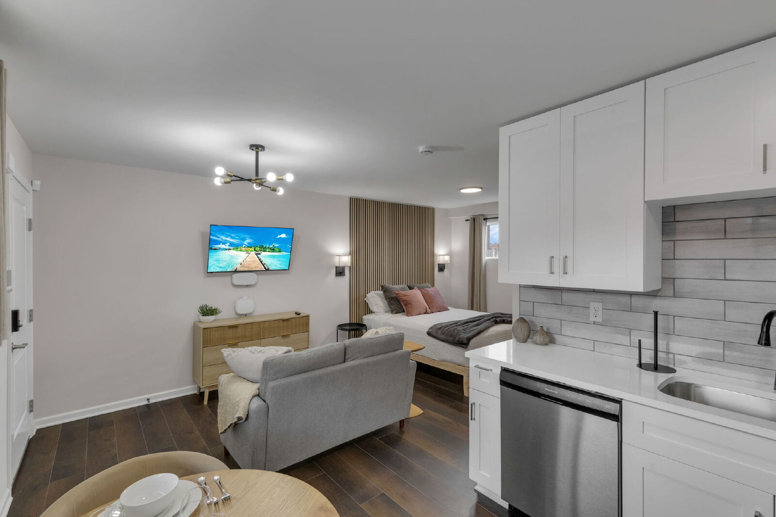 This first-floor studio has been renovated top to bottom with quality finishes throughout. The fully equipped kitchen is ready for everyday cooking, with a dining table for two. The living area features a comfortable queen bed, plush sofa, and wall-mounted smart TV. A private walk-in shower, quartz vanity, and in-unit stacked washer and dryer round out the space.