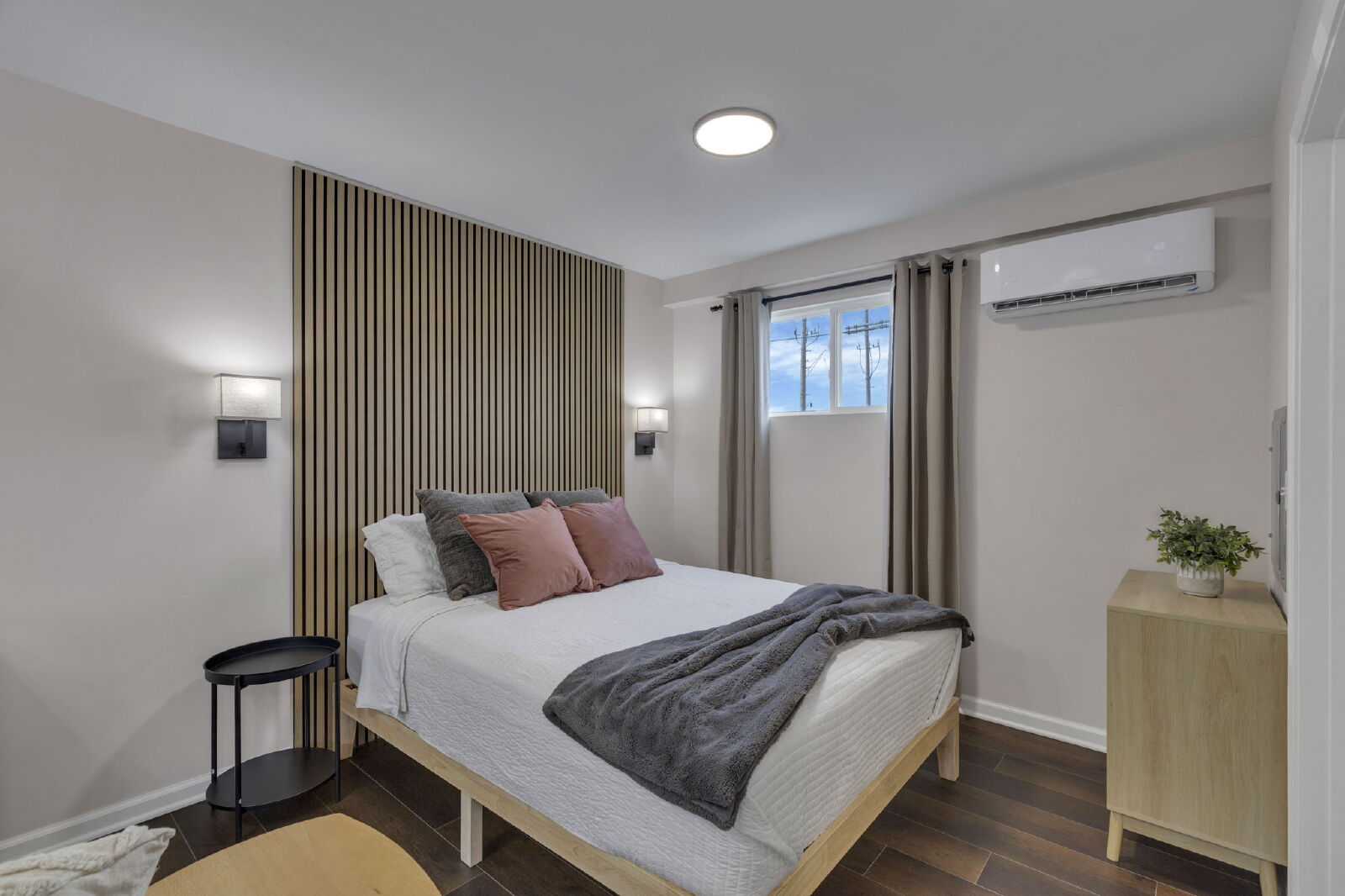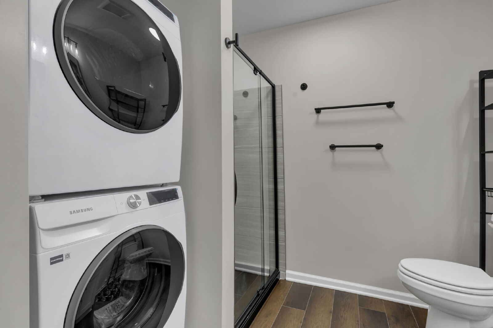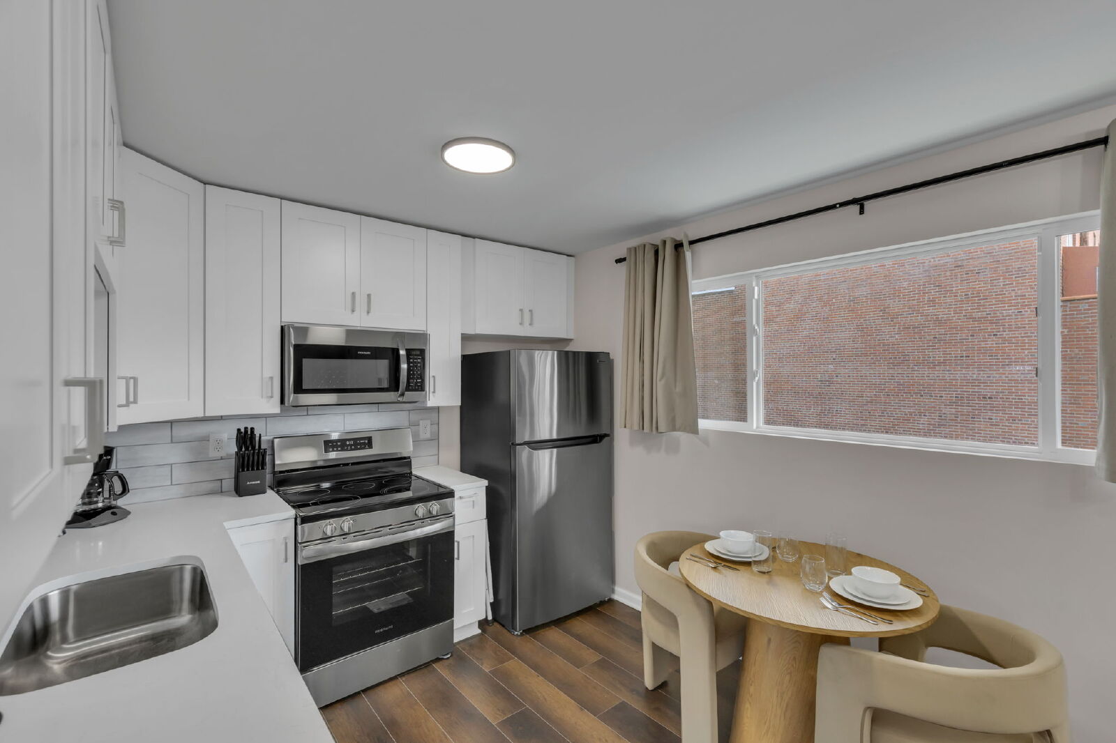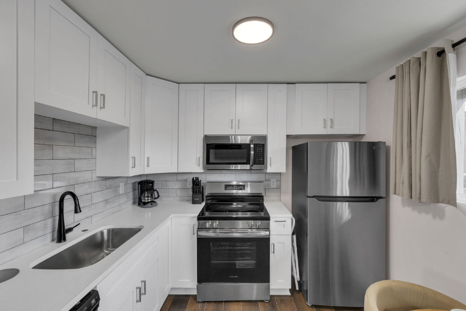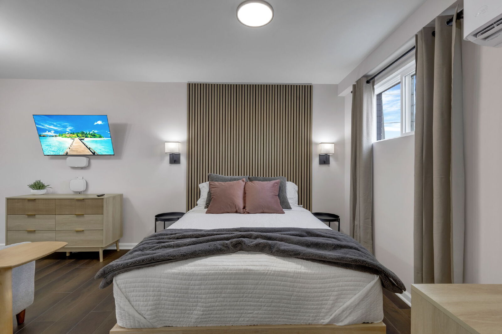 This first-floor studio has been renovated top to bottom with quality finishes throughout. The fully equipped kitchen is ready for everyday cooking, with a dining table for two. The living area features a comfortable queen bed, plush sofa, and wall-mounted smart TV. A private walk-in shower, quartz vanity, and in-unit stacked washer and dryer round out the space.