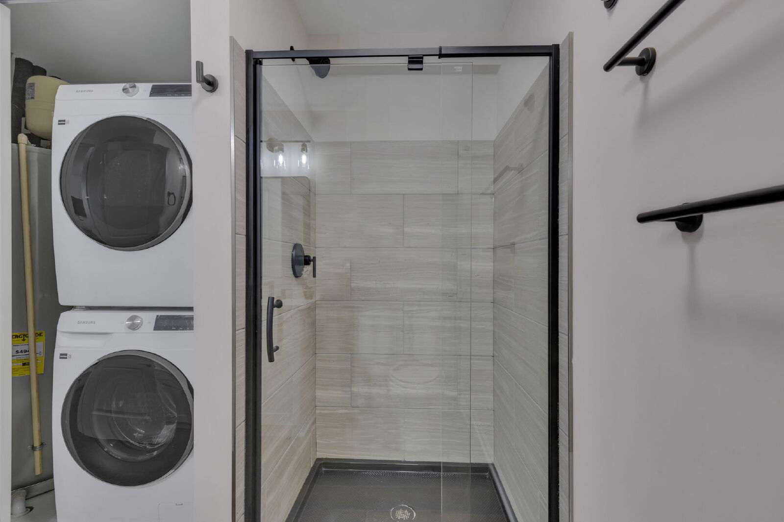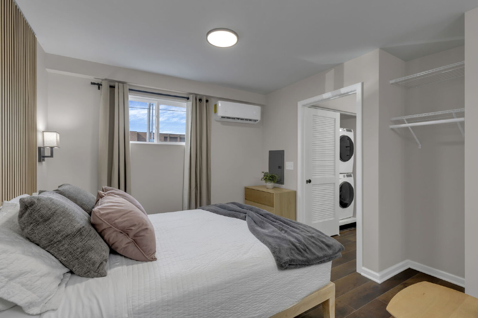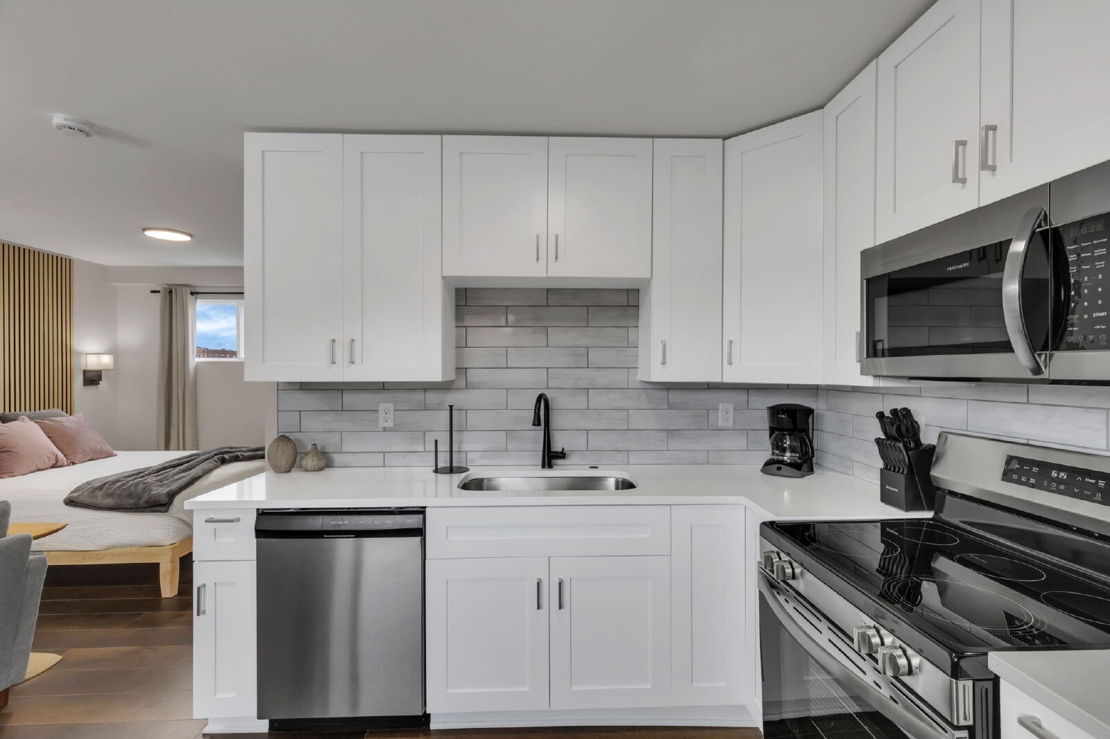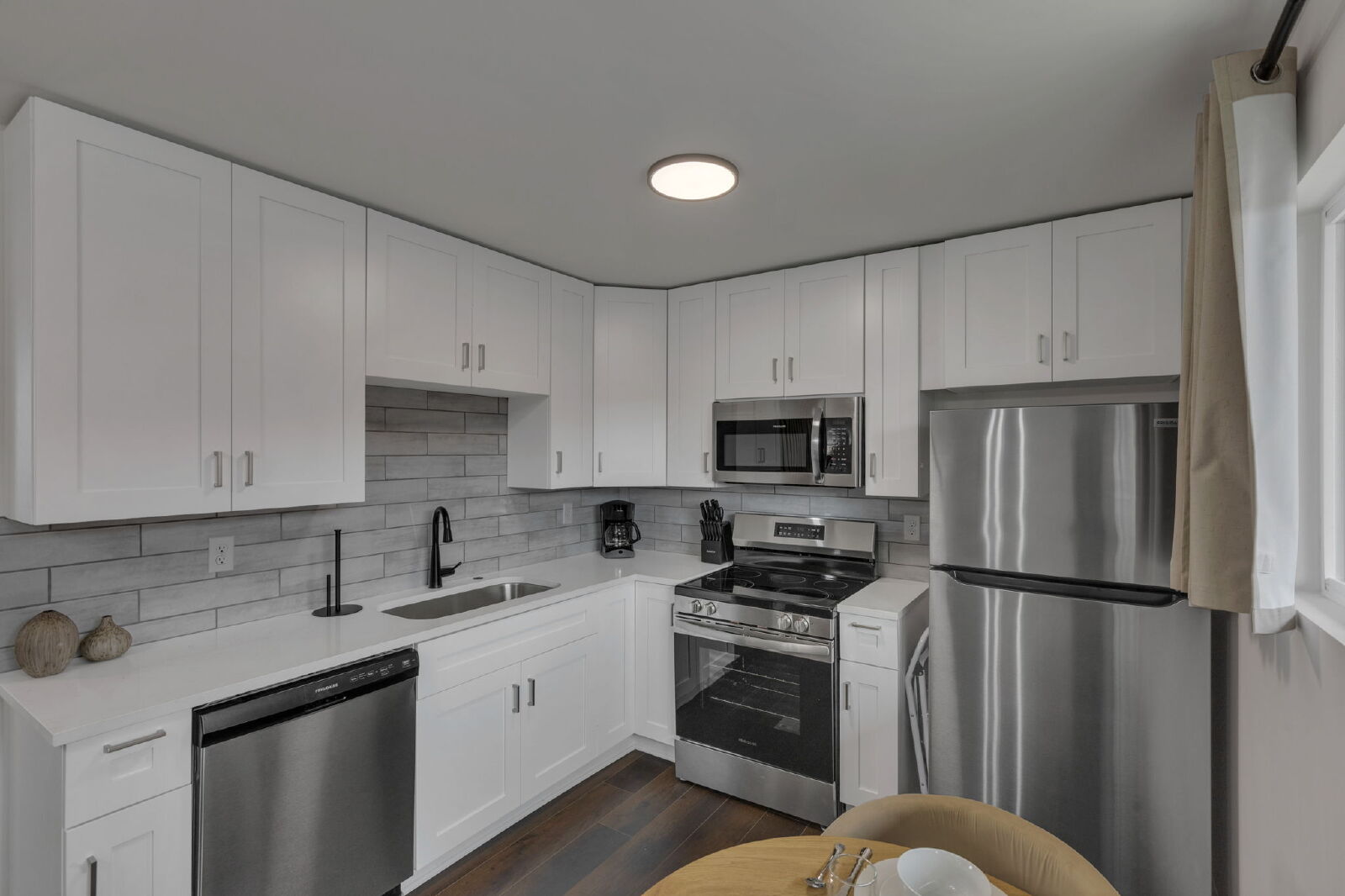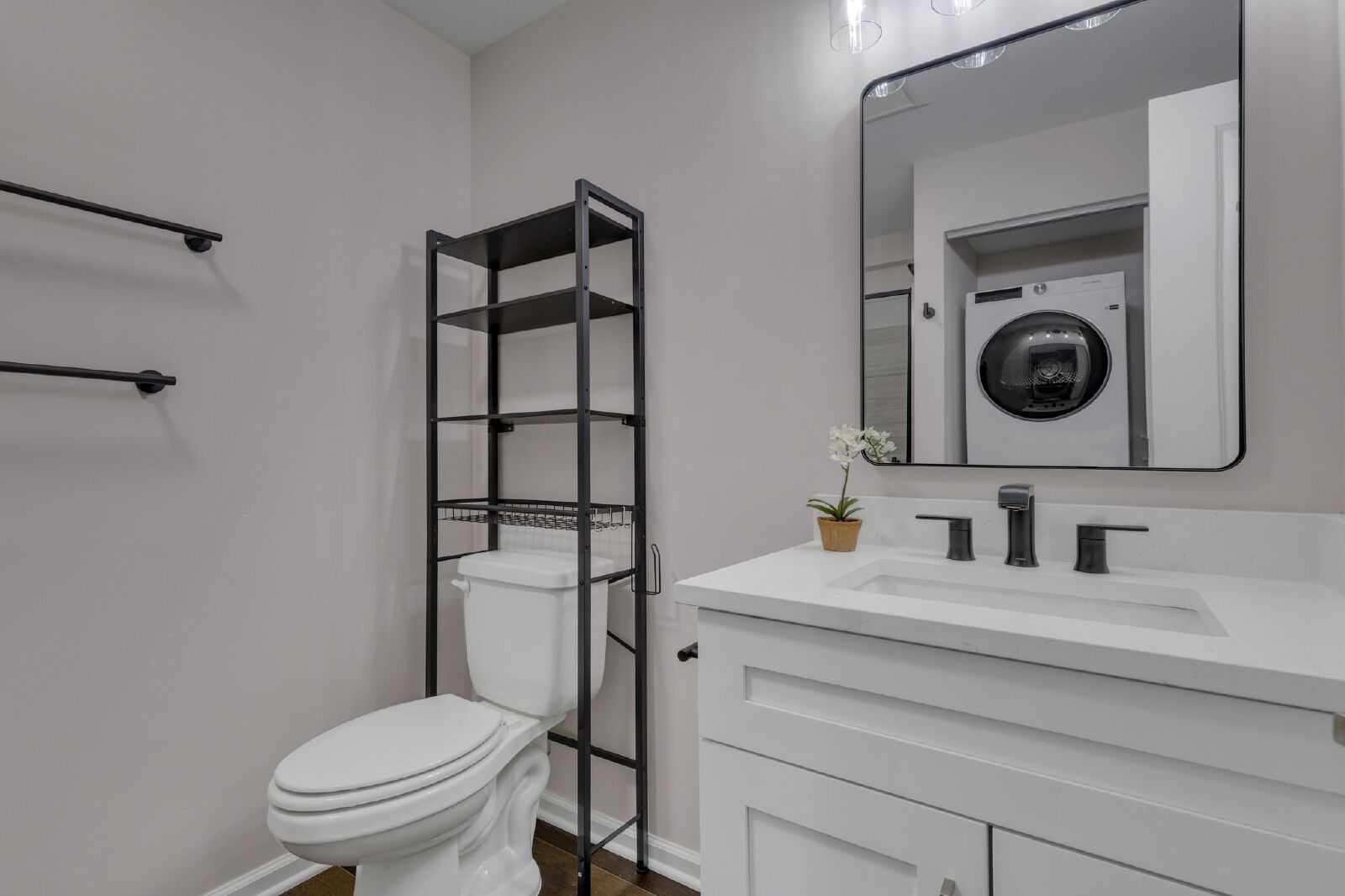 This first-floor studio has been renovated top to bottom with quality finishes throughout. The fully equipped kitchen is ready for everyday cooking, with a dining table for two. The living area features a comfortable queen bed, plush sofa, and wall-mounted smart TV. A private walk-in shower, quartz vanity, and in-unit stacked washer and dryer round out the space.